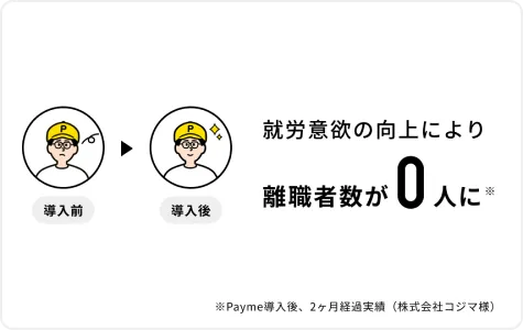 新しい職場では、給与受け取りまでに平均で55日かかり、生活が不安定な従業員様だと短期アルバイトへ移行してしまうケースが増えています。 Paymeを導入すれば、好きな時に必要な分だけ給与を受け取ることができます。複数の職場を掛け持ちすることなく、一つの職場環境に馴染めるので、長期雇用につながります。
